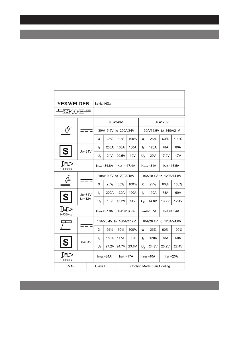 On the machine, there is a plate that includes all the operating specifications for your new unit. The duty cycle rating of a welding