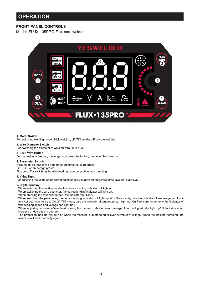 and hot start can light up; On Lift TIG mode, only the indicator Of amperage can light up; On Flux core mode, Only the indicator Of