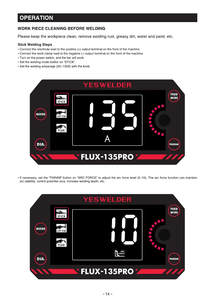 • If necessary, set the "PARAM" button on "ARC FORCE" to adjust the arc force level (0-10) The arc force function can maintain