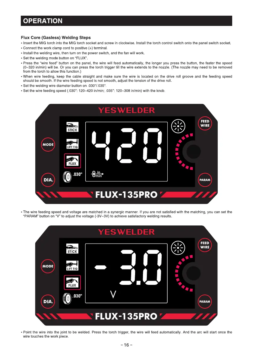 • Set the welding mode button on "FLUX"