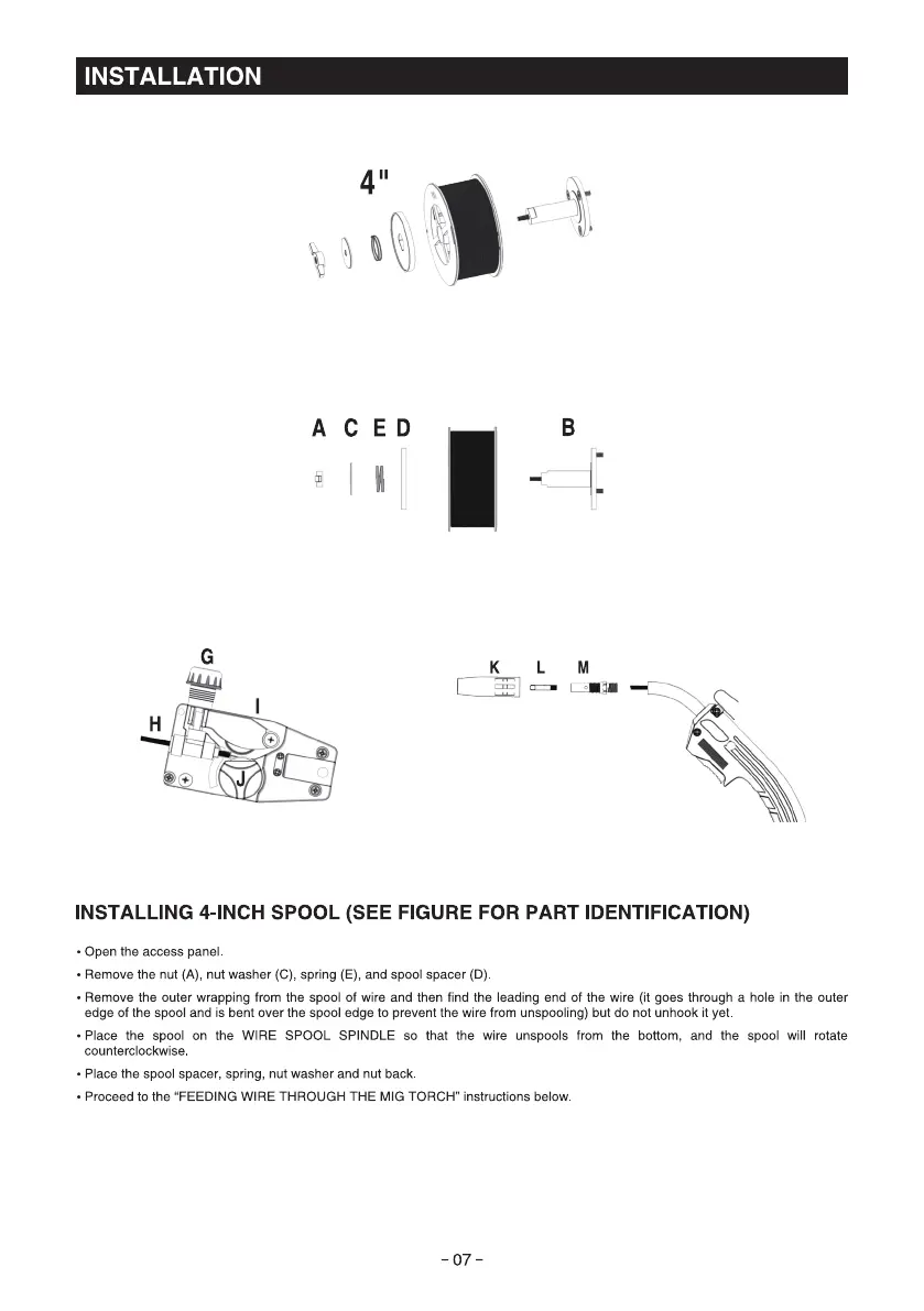 • Place the spool On the WIRE SPOOL SPINDLE so that the wire unspools from the bottom, and the spool will rotate