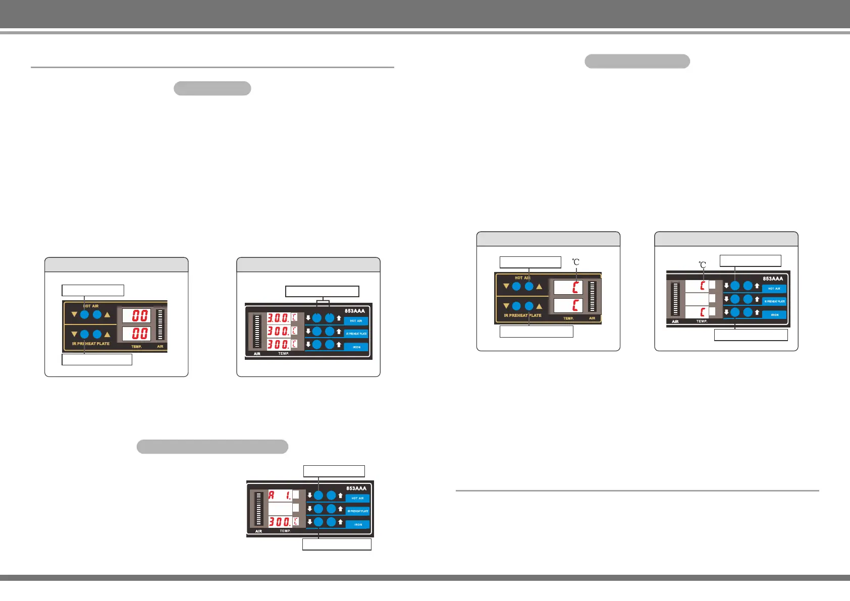 A、⻛枪、烙铁、预热台恒温后,同时按下温度加减键2秒,显⽰屏显⽰设置温度,