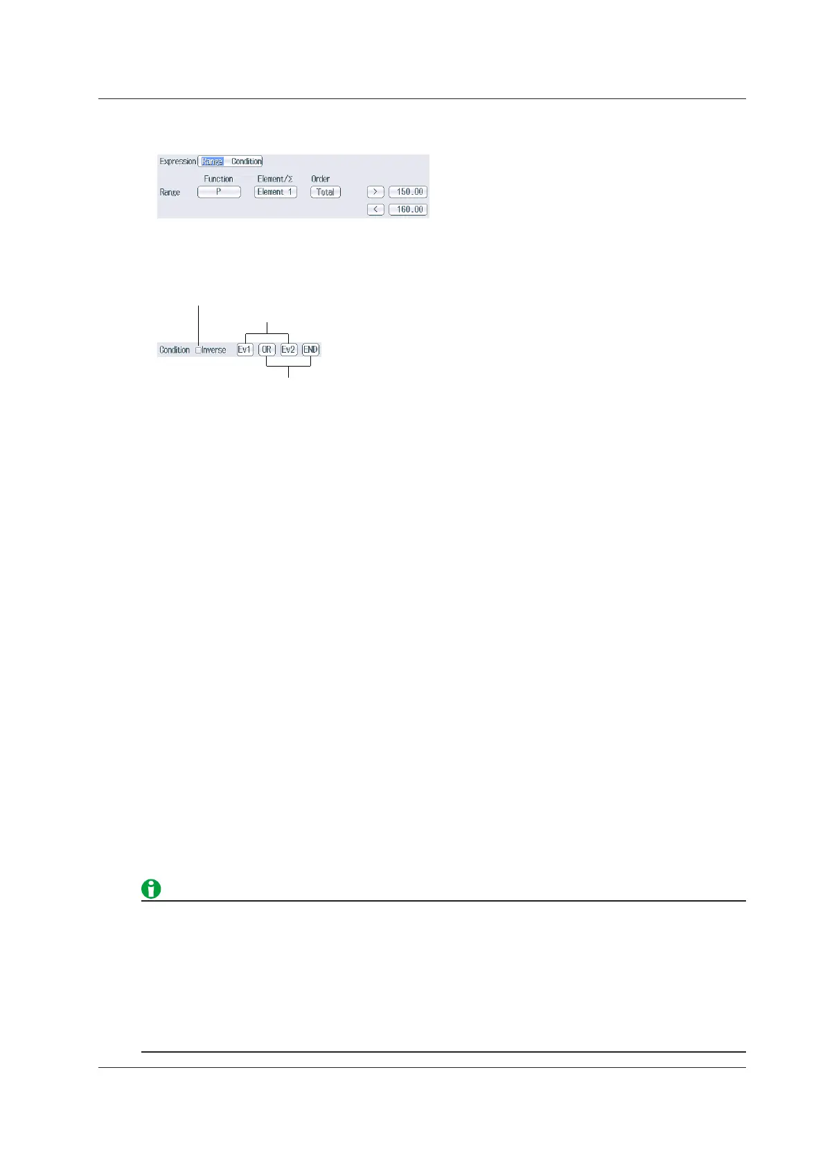 For example, a condition that is true when 150 < the measured power value of element 1 < 160 W and false