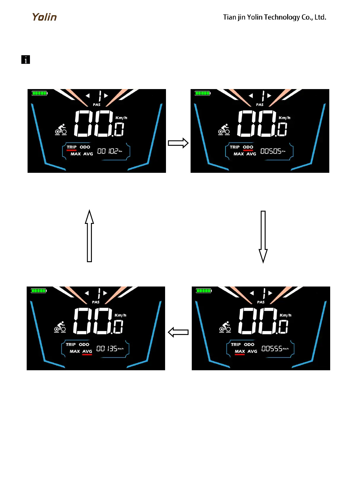 to switched cyclically between Trip Odometer(km), Odometer (km), Maximum Speed (km/h), and Average Speed