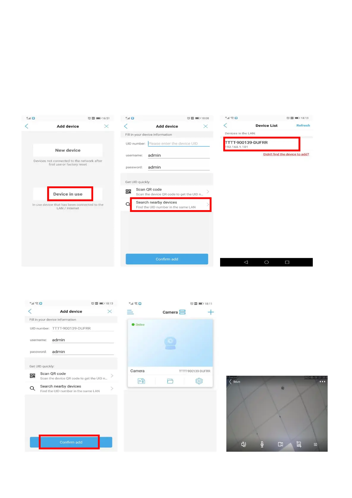 C) Go back to camera device list. Camera is displayed online, Click camera for real-time preview.