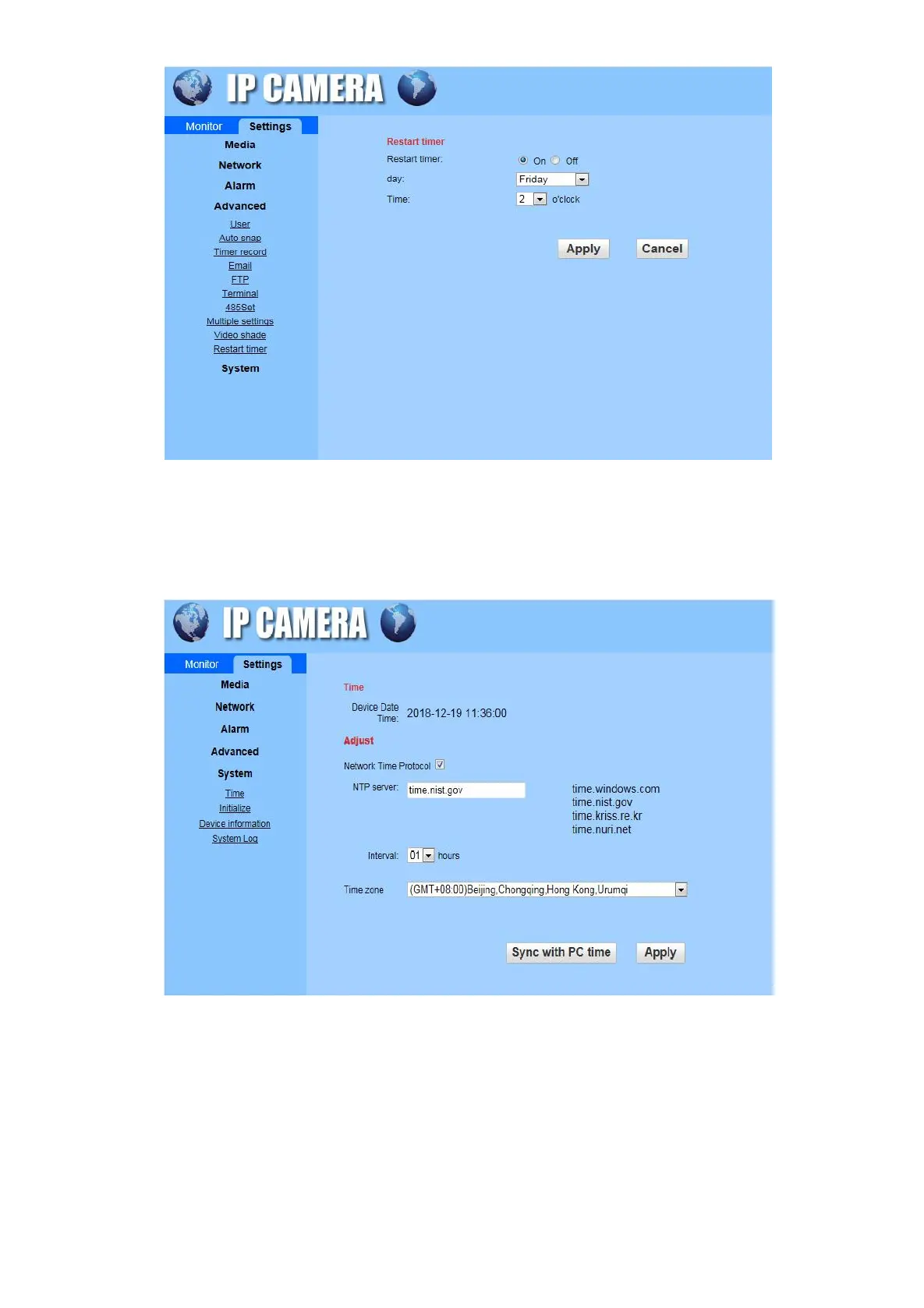 Time: Select the NTP server to synchronize the camera with the internet network time, click to “Sync with