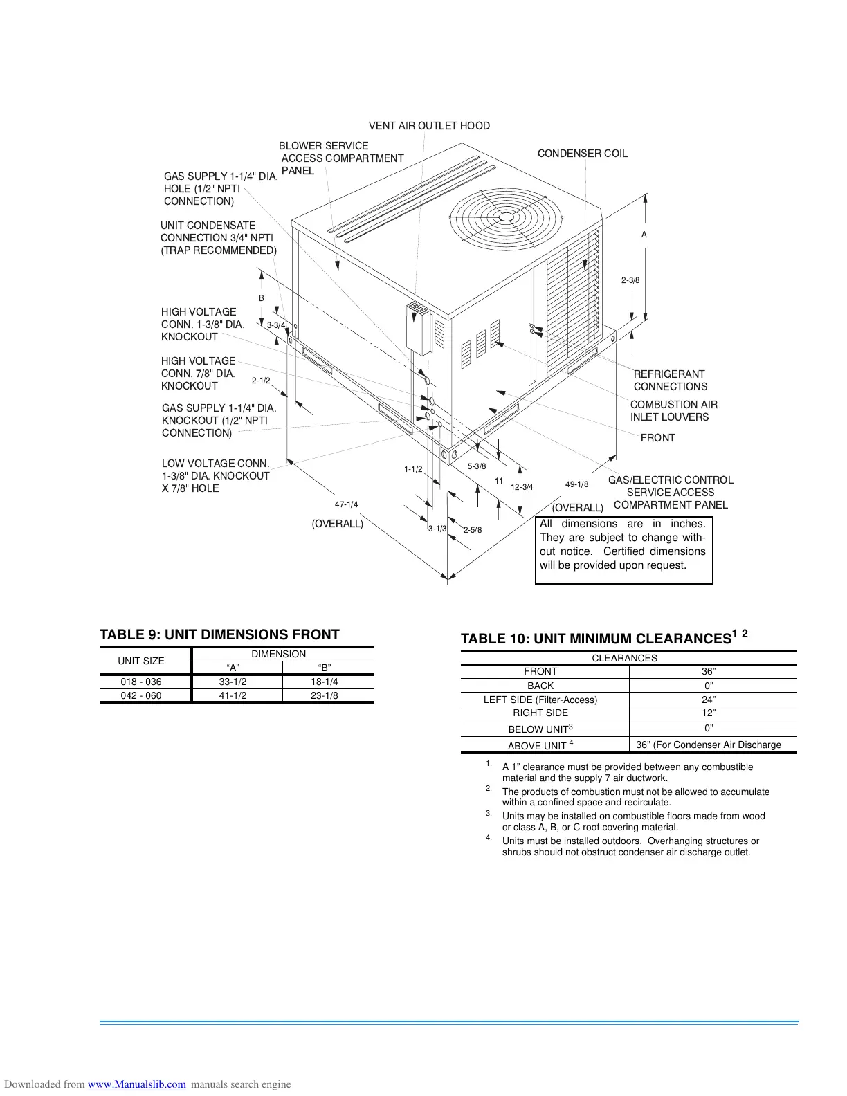 TABLE 9: UNIT DIMENSIONS FRONT