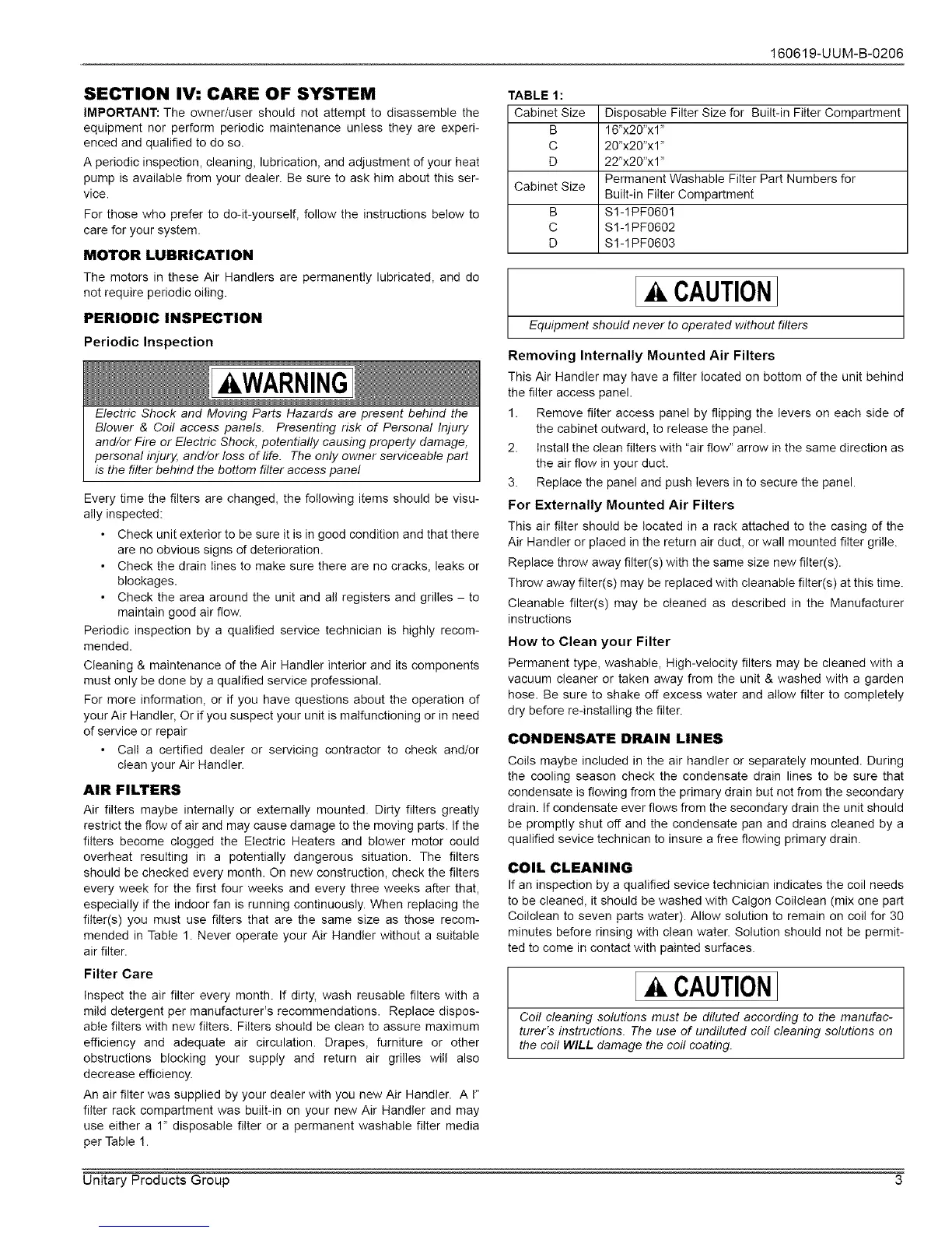 mended in Table 1. Never operate your Air Handler without a suitable