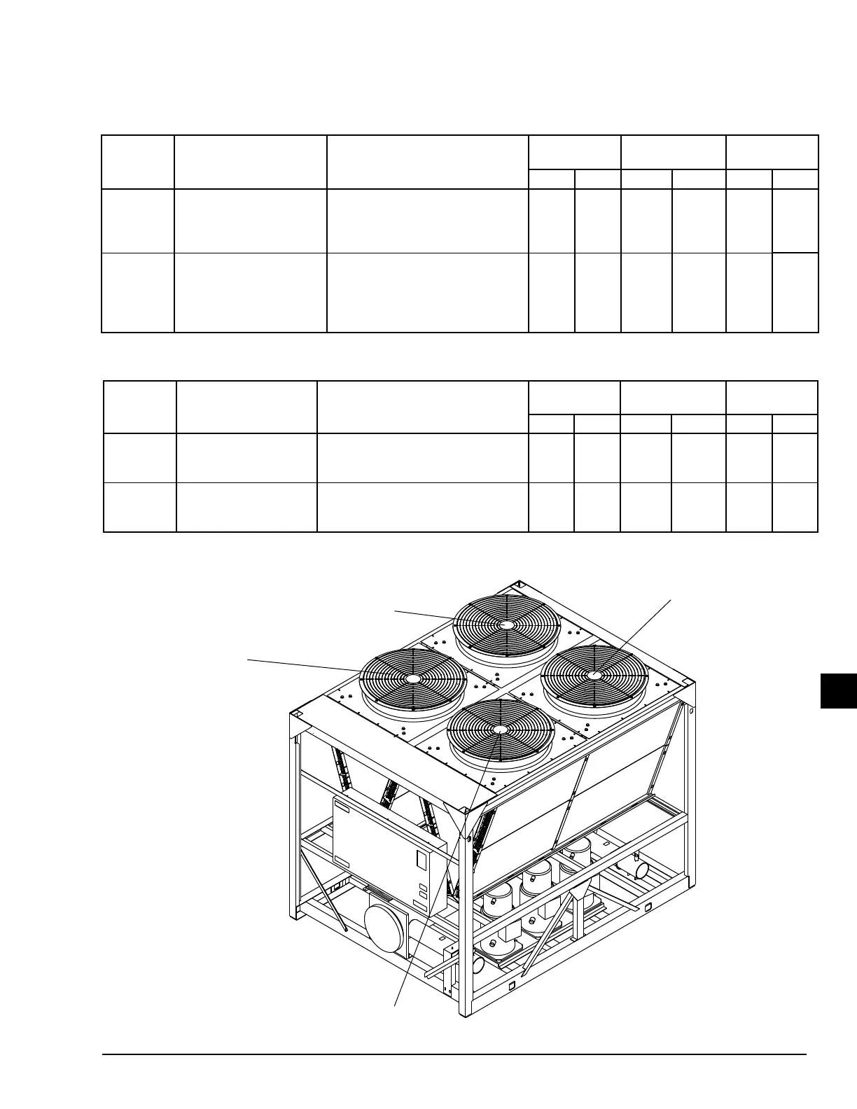 York YCUL0072EE - TABLE 20 - YCUL0045 - YCUL0072 Condenser Fan Control Using Discharge Pressure Only; FIGURE 42 - YCUL0045 - YCUL0072 Fan Location (Typical); TABLE 19 - YCUL0020 - YCUL0072 Condenser Fan Control Using Outdoor Ambient Temperature and Discharge Pressure