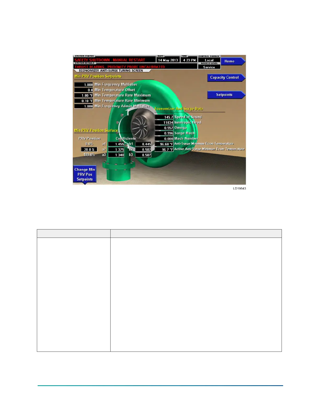 This screen will show all the data and settings relating to capacity control anti-surge setpoints.