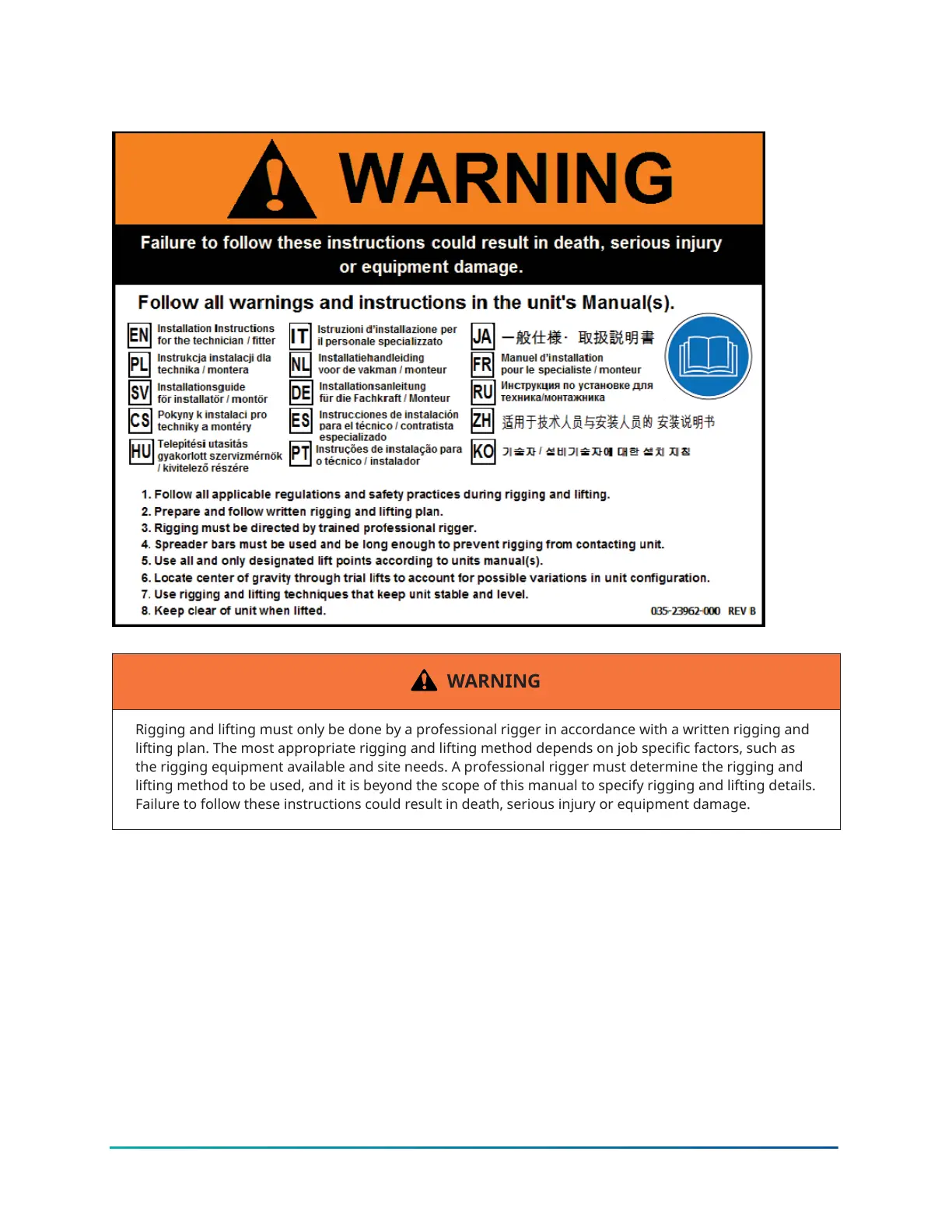 Rigging and lifting must only be done by a professional rigger in accordance with a written rigging and