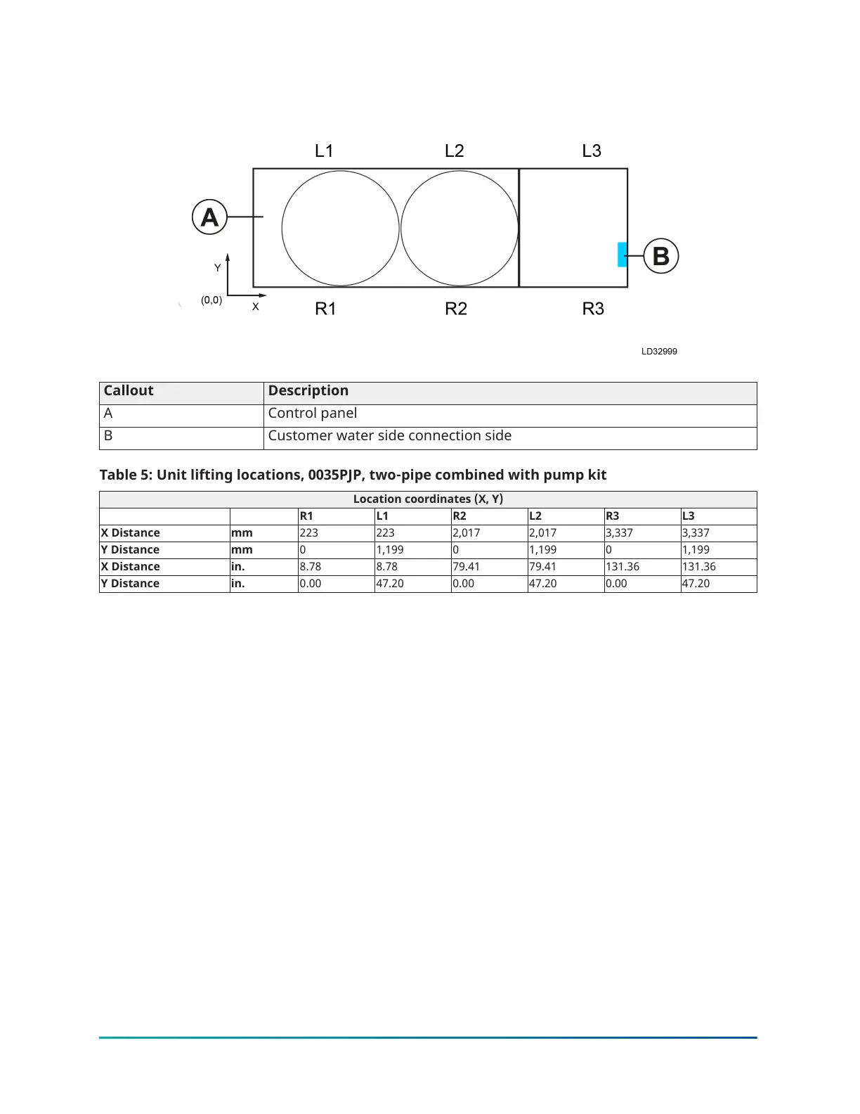 Table 5: Unit lifting locations, 0035PJP, two-pipe combined with pump kit