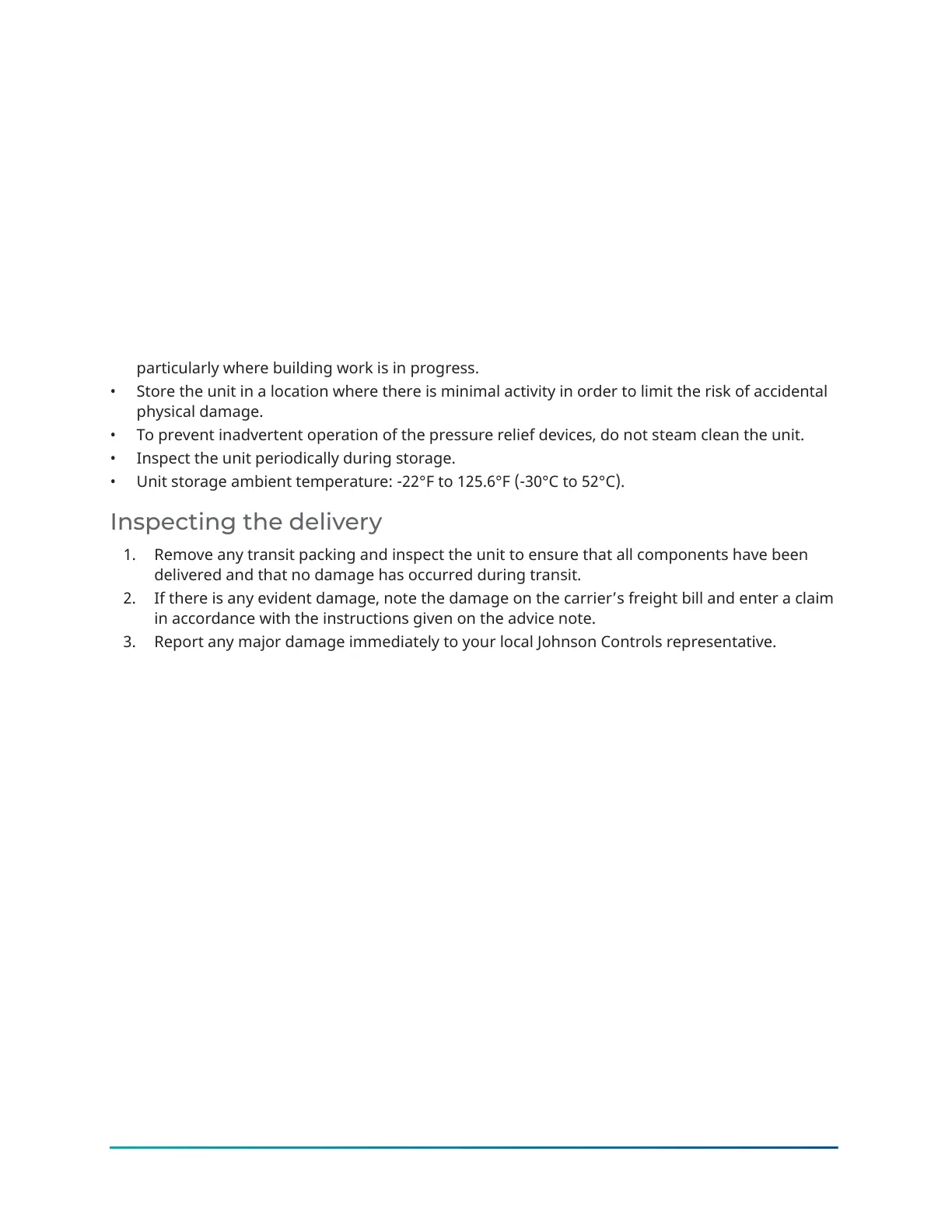 3. Report any major damage immediately to your local Johnson Controls representative.