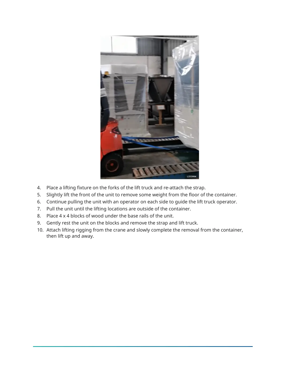 9. Gently rest the unit on the blocks and remove the strap and lift truck.