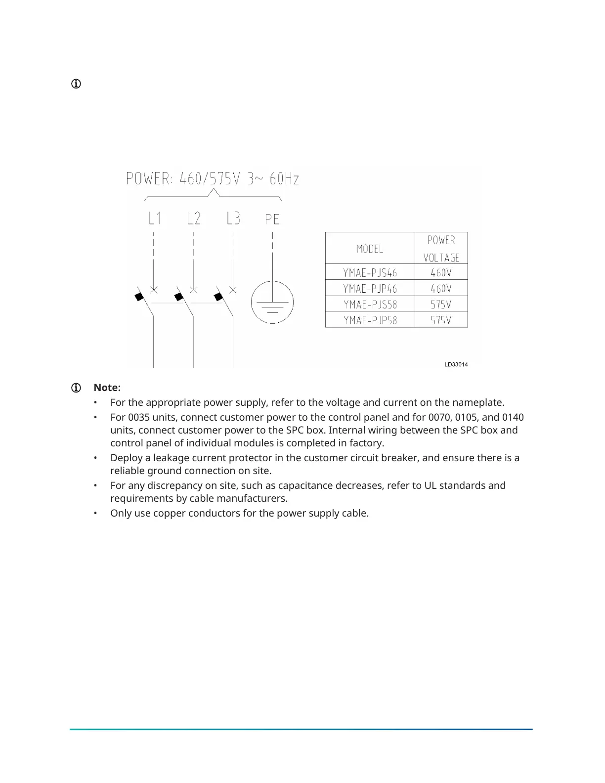 • For 0035 units, connect customer power to the control panel and for 0070, 0105, and 0140