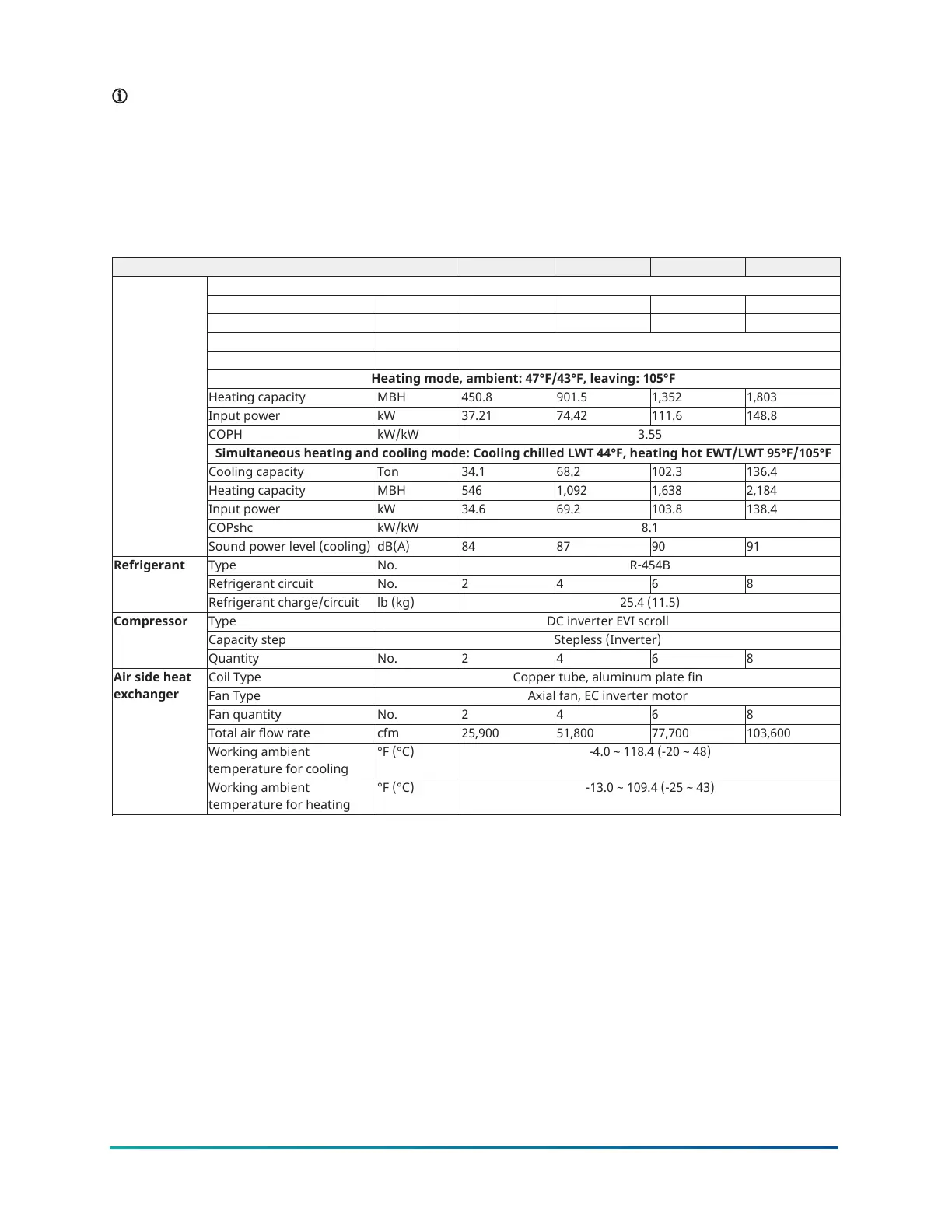 • Rated heating performance: hot LWT 105°F (40.6°C), outdoor air 47°F/43°F (8.4°C/6.1°C)