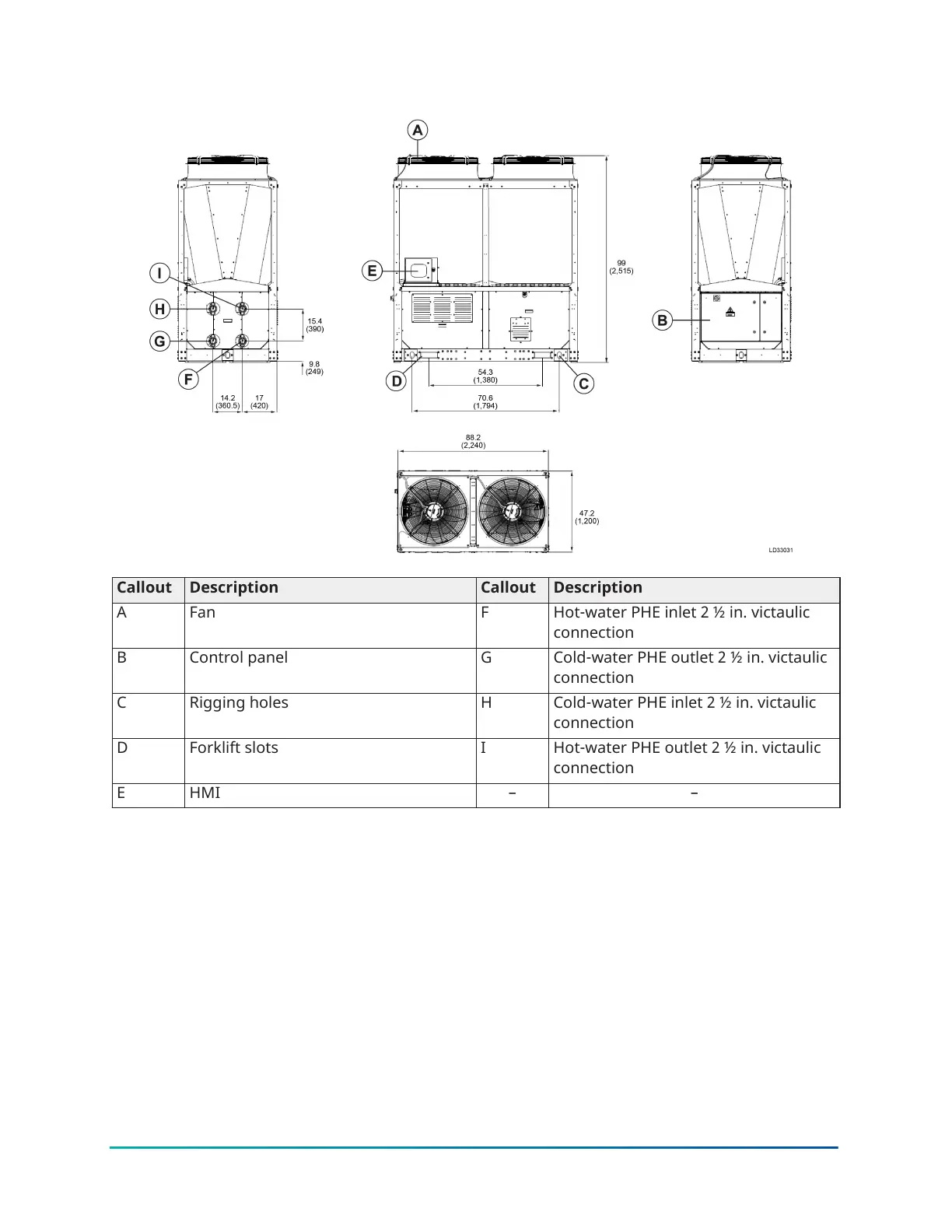 D Forklift slots I Hot-water PHE outlet 2 ½ in. victaulic