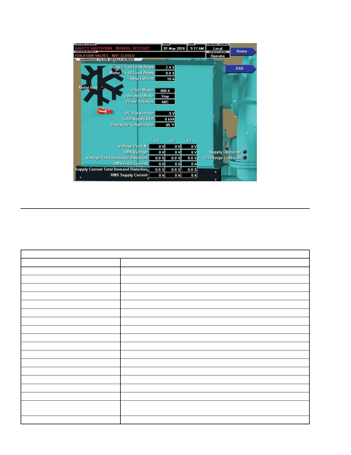 Voltage Total Harmonic Distortion Displays the percentage of Harmonic Distortion for L1, L2 and L3.