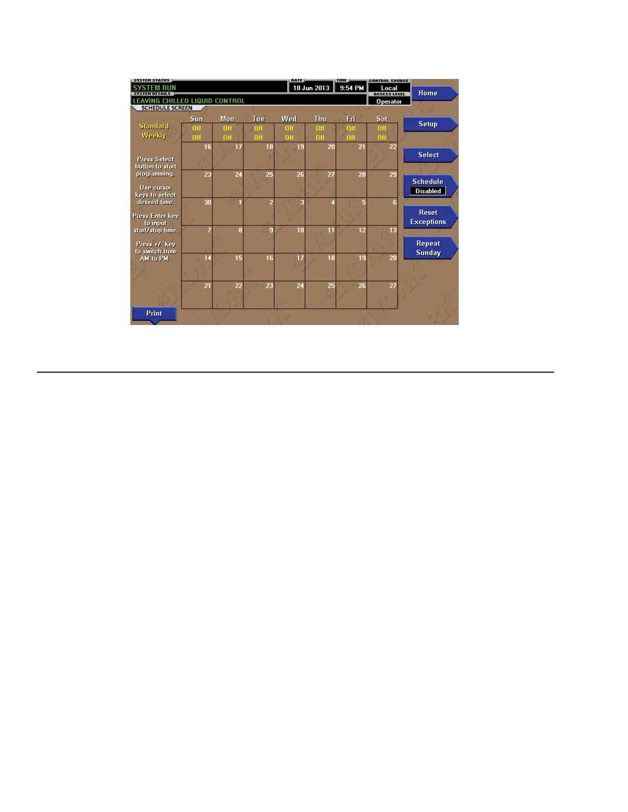 The schedule screen contains more programmable val-