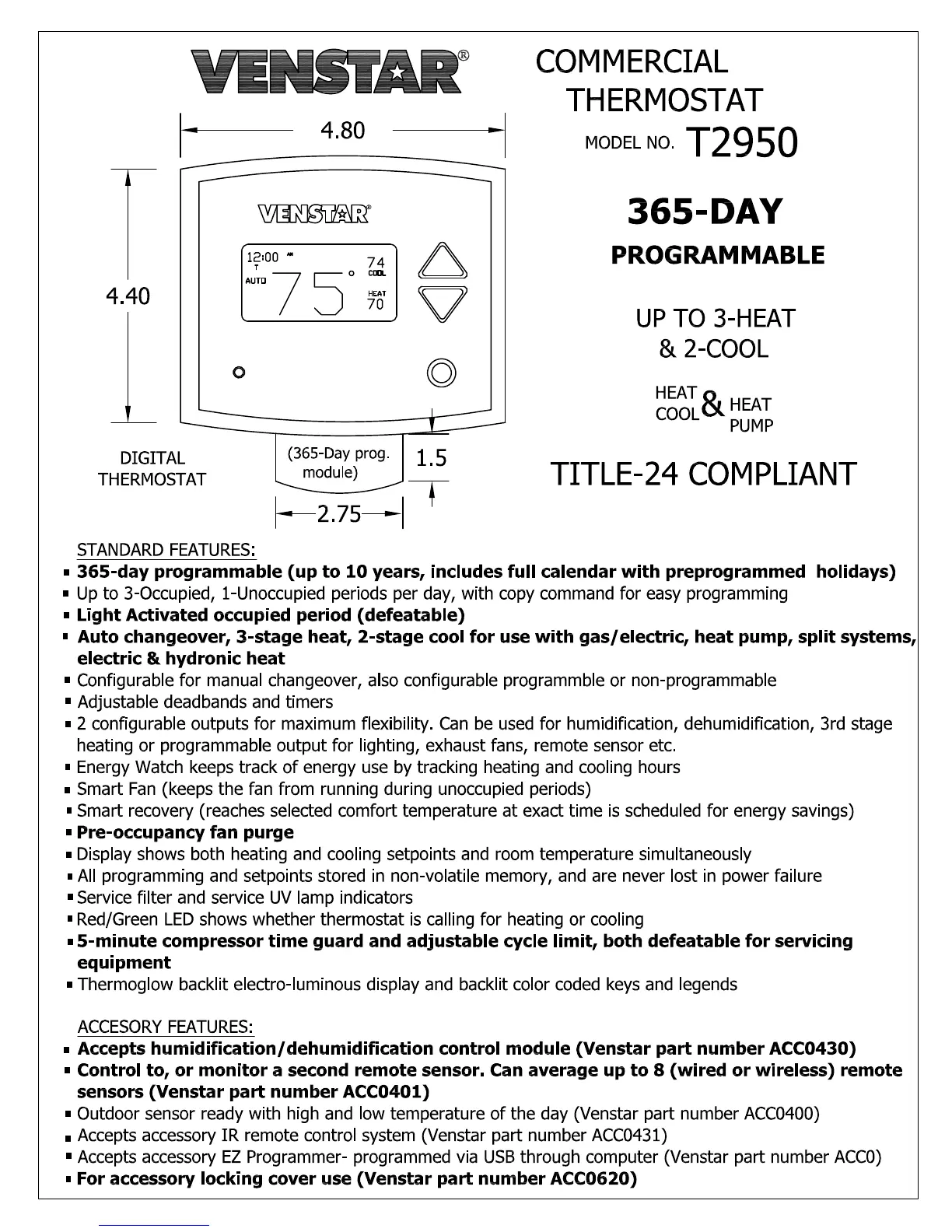 York YZB018 - Commercial Thermostat T2950; Standard Features; Accessory Features