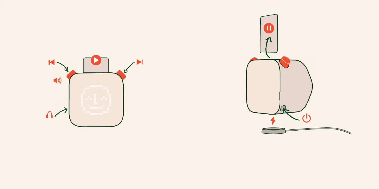 (En) 1. Play Audio 2.Press: skip backward 3.Turn: Volume 4.Headphone Jack 5. Turn: Navigate