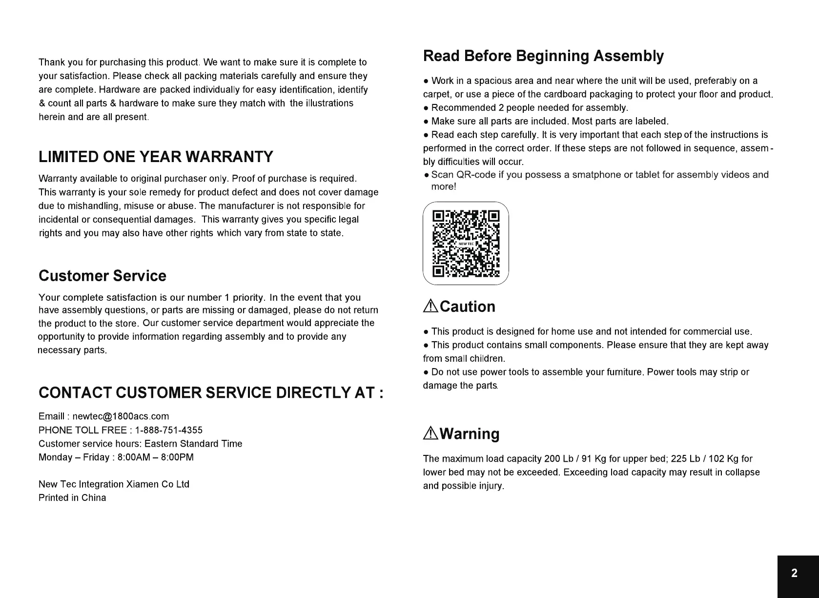 your zone YZ1102126571001 - Product Information and Preparation; Read Before Beginning Assembly; Limited One Year Warranty; Customer Service Information