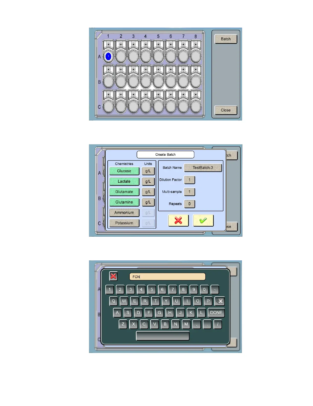 10. To change the Batch Name from the default value of TestBatch- #, touch the [TestBatch- #] button. The keypad