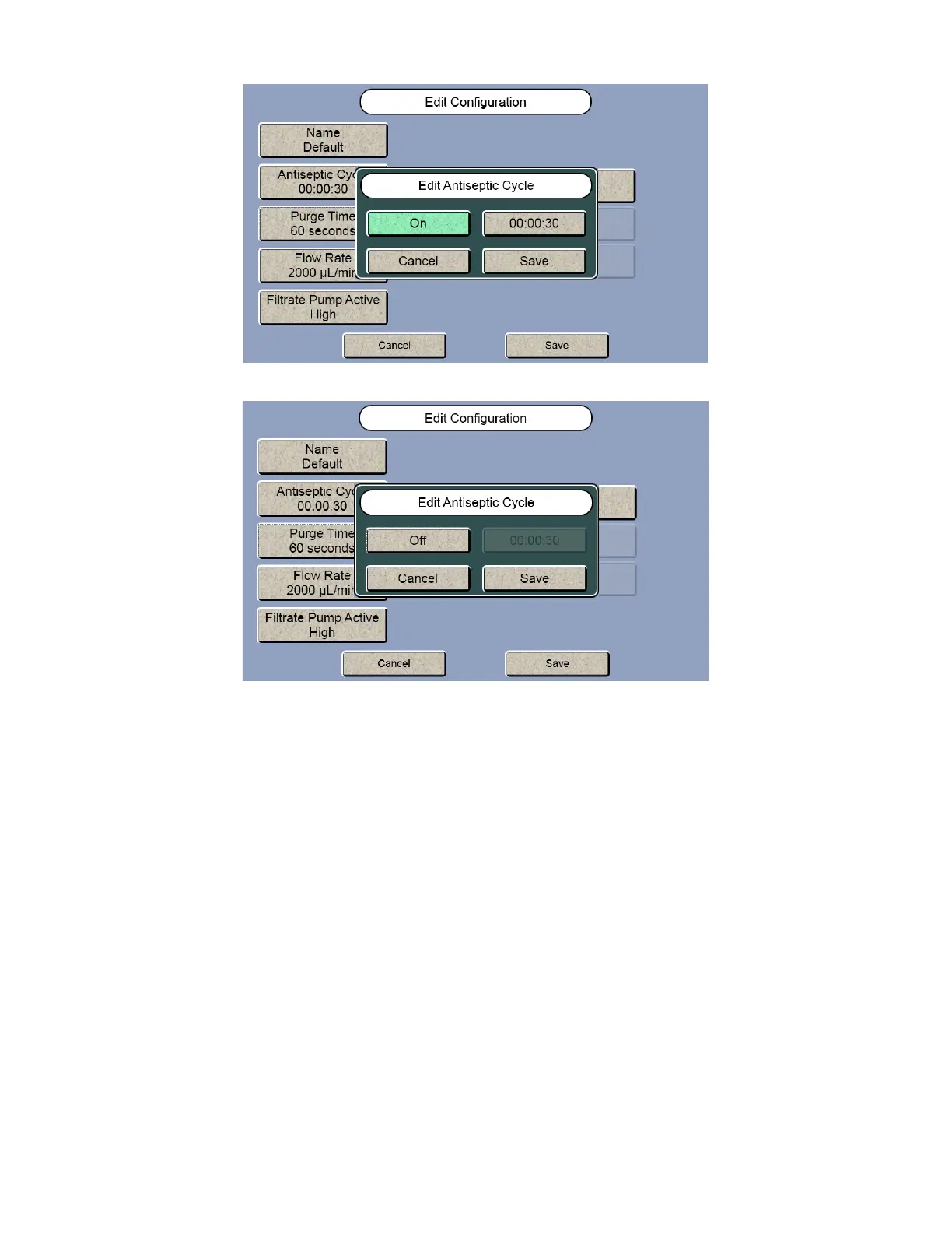 7. Touch the [On] button and change it to [Off] if you are not using and antiseptic solution.