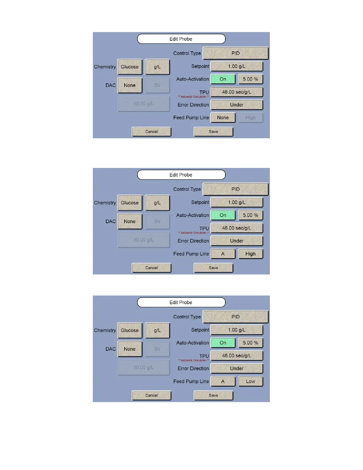 The default feed pump output is Active High (+5V). Touch the Feed Pump Line [High] button to change it to [Low] if your