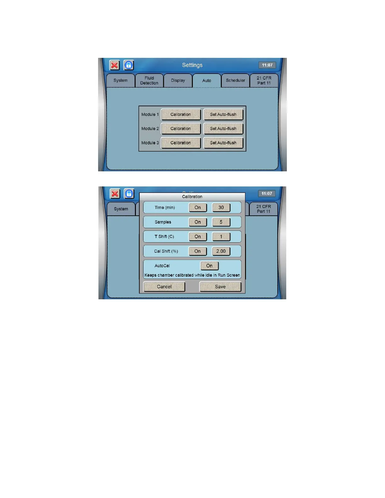 From the Configuration screen, touch the [Auto] tab to display the Auto-Cal and Auto-Flush settings.