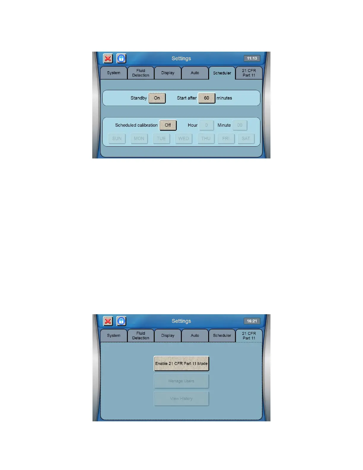 From the Settings screen, touch the [21 CFR Part 11] tab.
