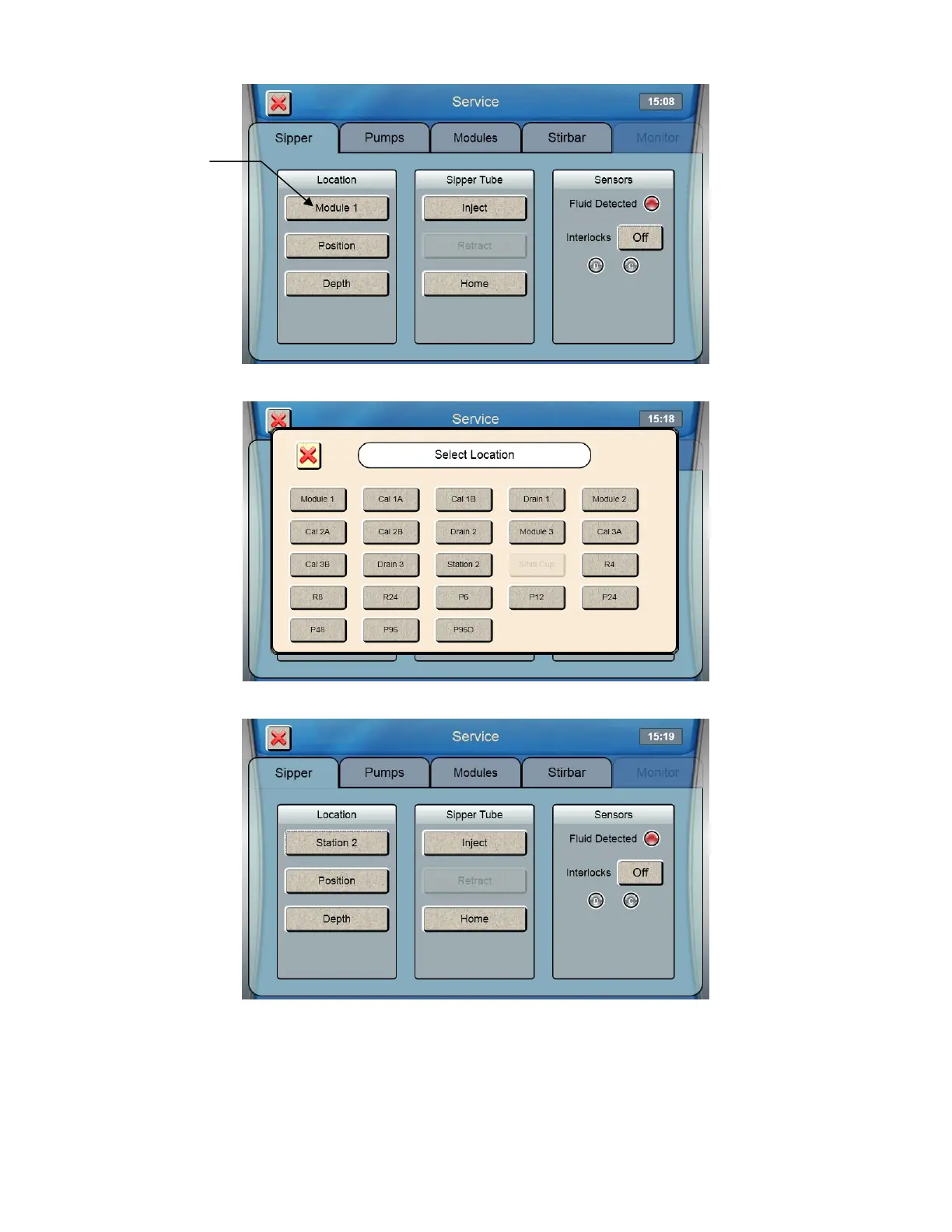 To align the sipper at other locations, touch the button under Location.