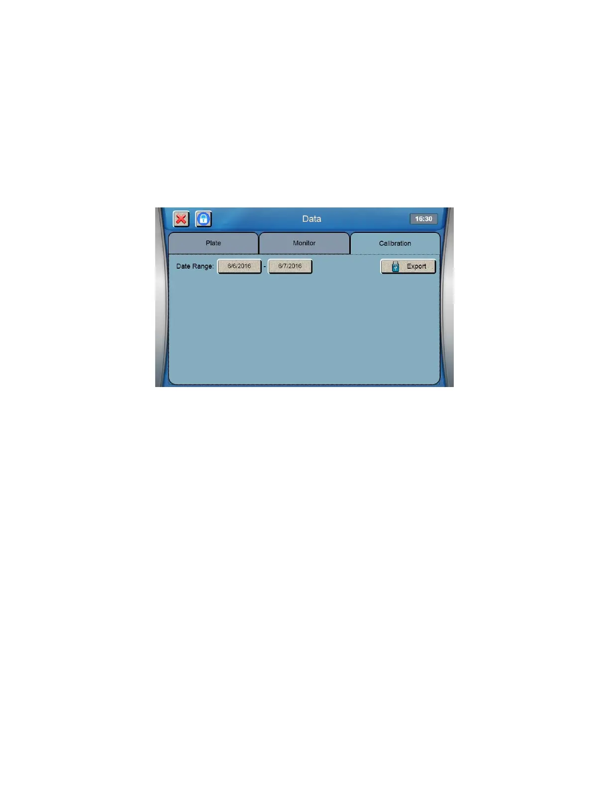 Plug a flash drive into the 2900 Series’ USB port. Select a date range, then press the [Export] button to send calibration