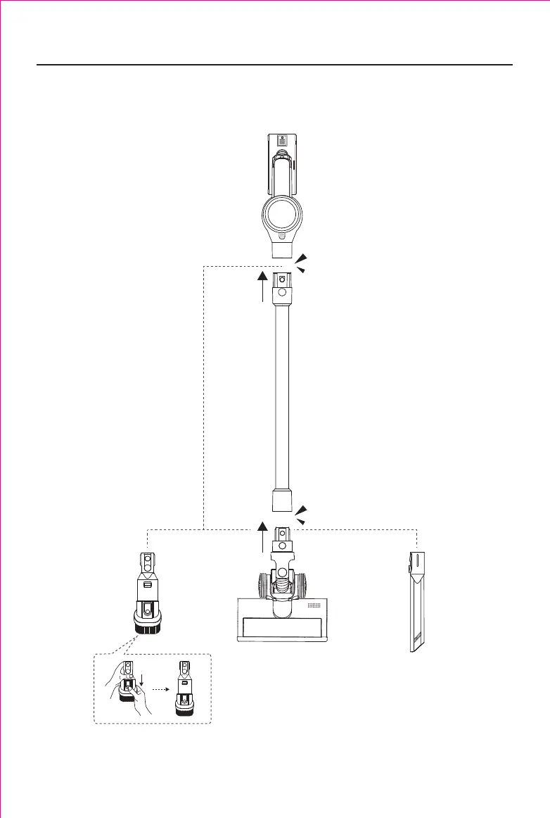 図に示すように、必要なクリーニングアクセサリを金属管または掃除機の本体に取り付けます。