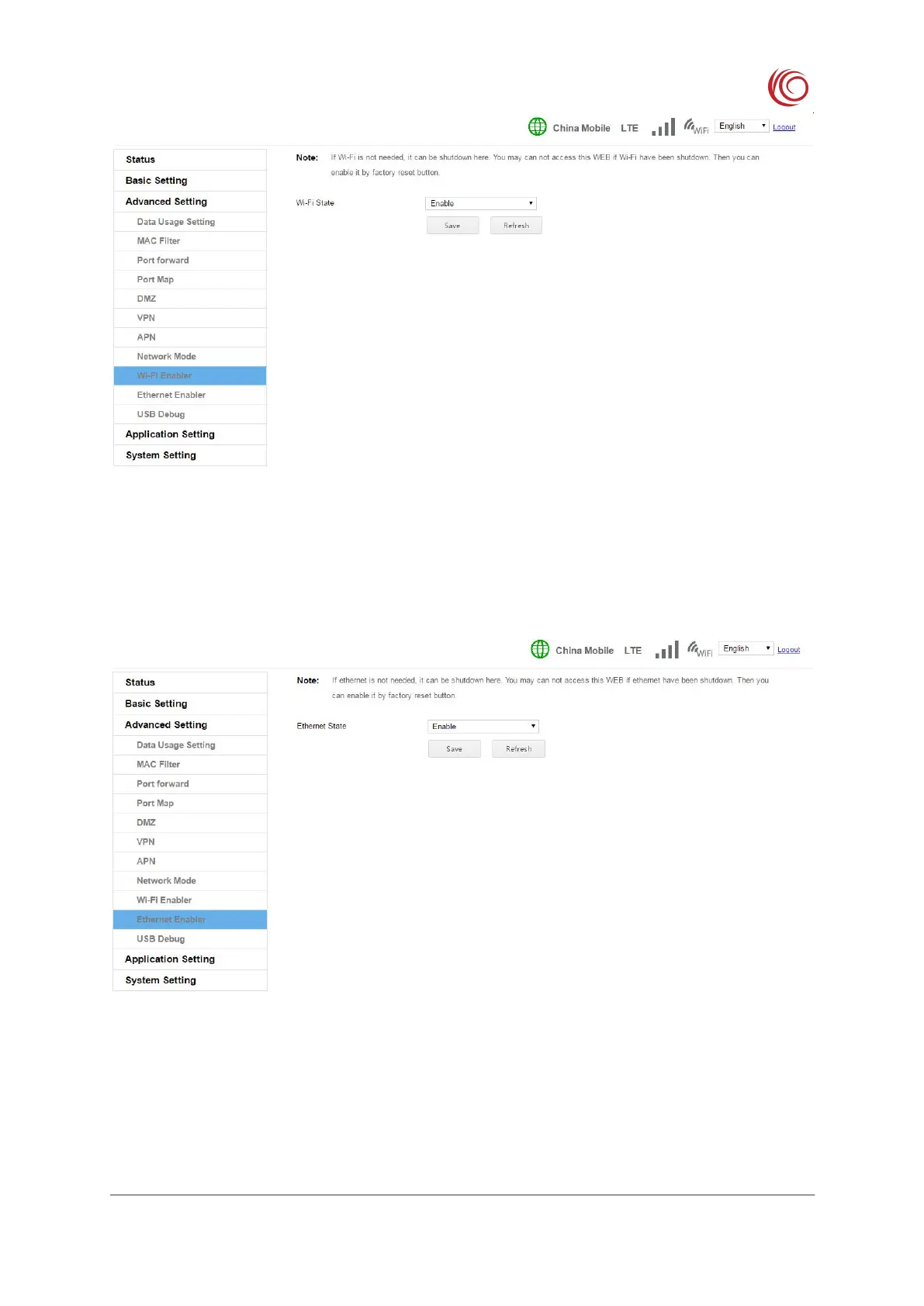 If you do not need the Ethernet function, you can turn off the Ethernet here. After turning
