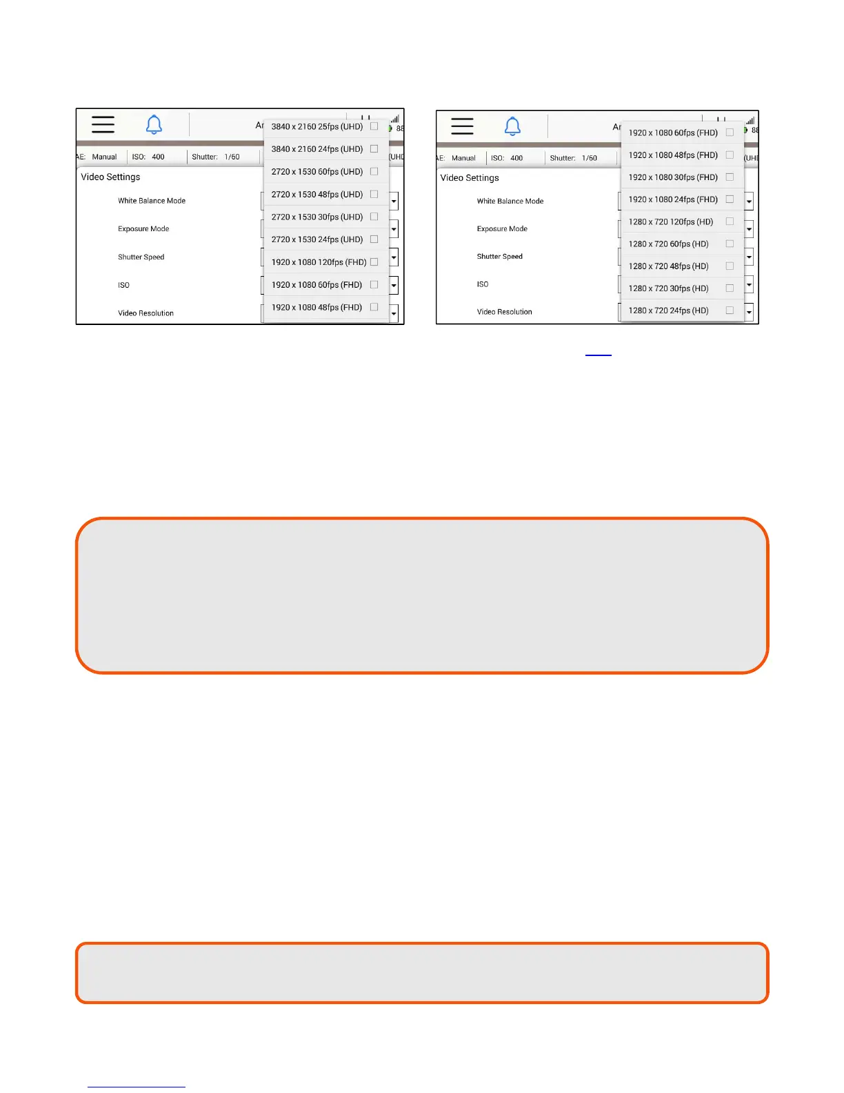 The following settings are available in the Video Resolution drop down list for E50