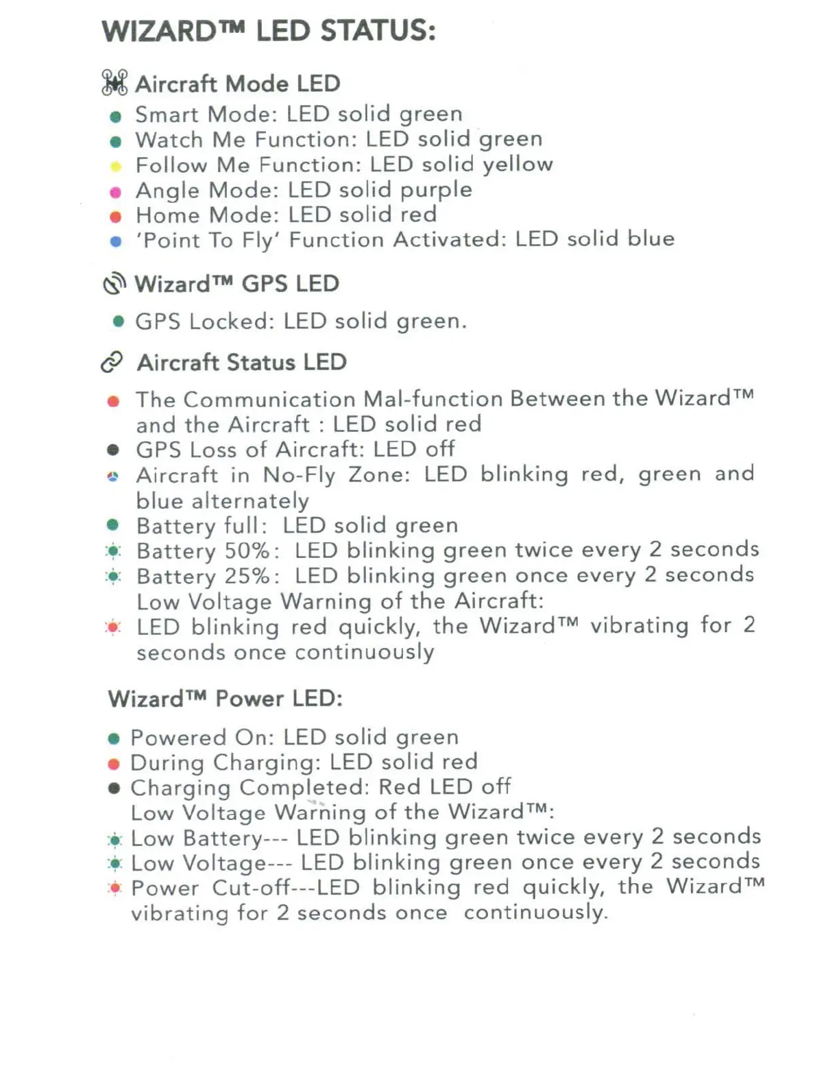YUNEEC TYPHOON Wizard - Wizard LED Status Indicators; Aircraft Mode LED Meanings; Wizard GPS LED Status; Aircraft Status LED Meanings