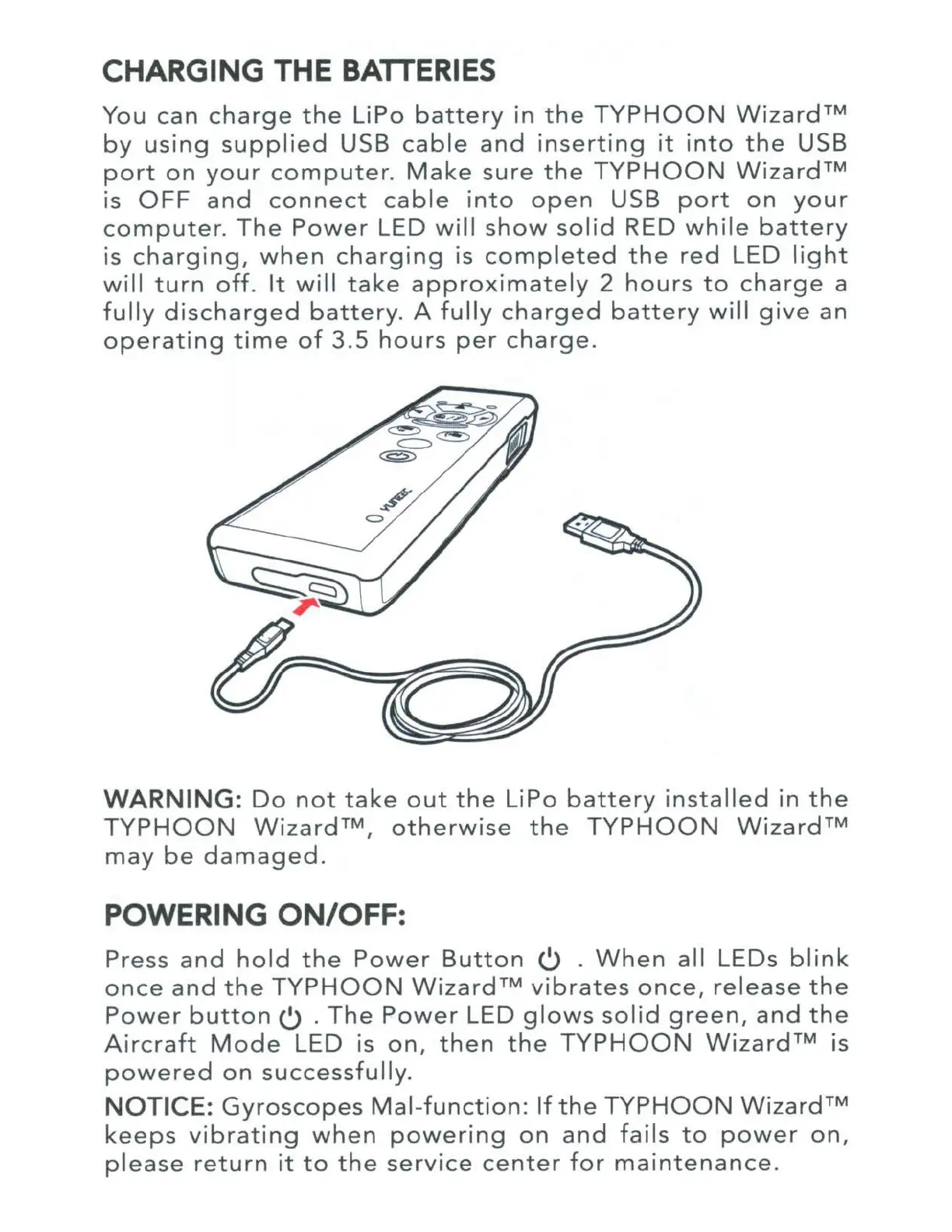 YUNEEC TYPHOON Wizard - Charging the Batteries; Charging Process; Powering On and Off