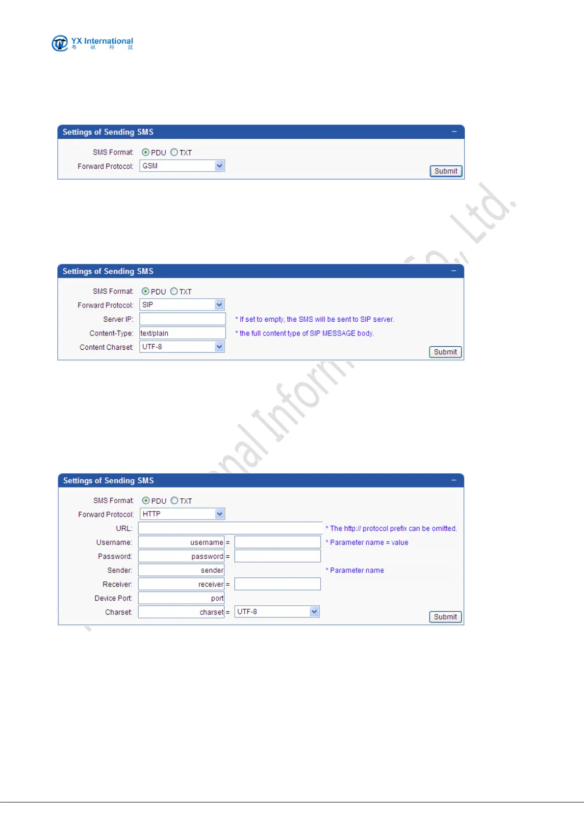 The screenshot below shows the operation mode to set sip protocol of forwarding sms.