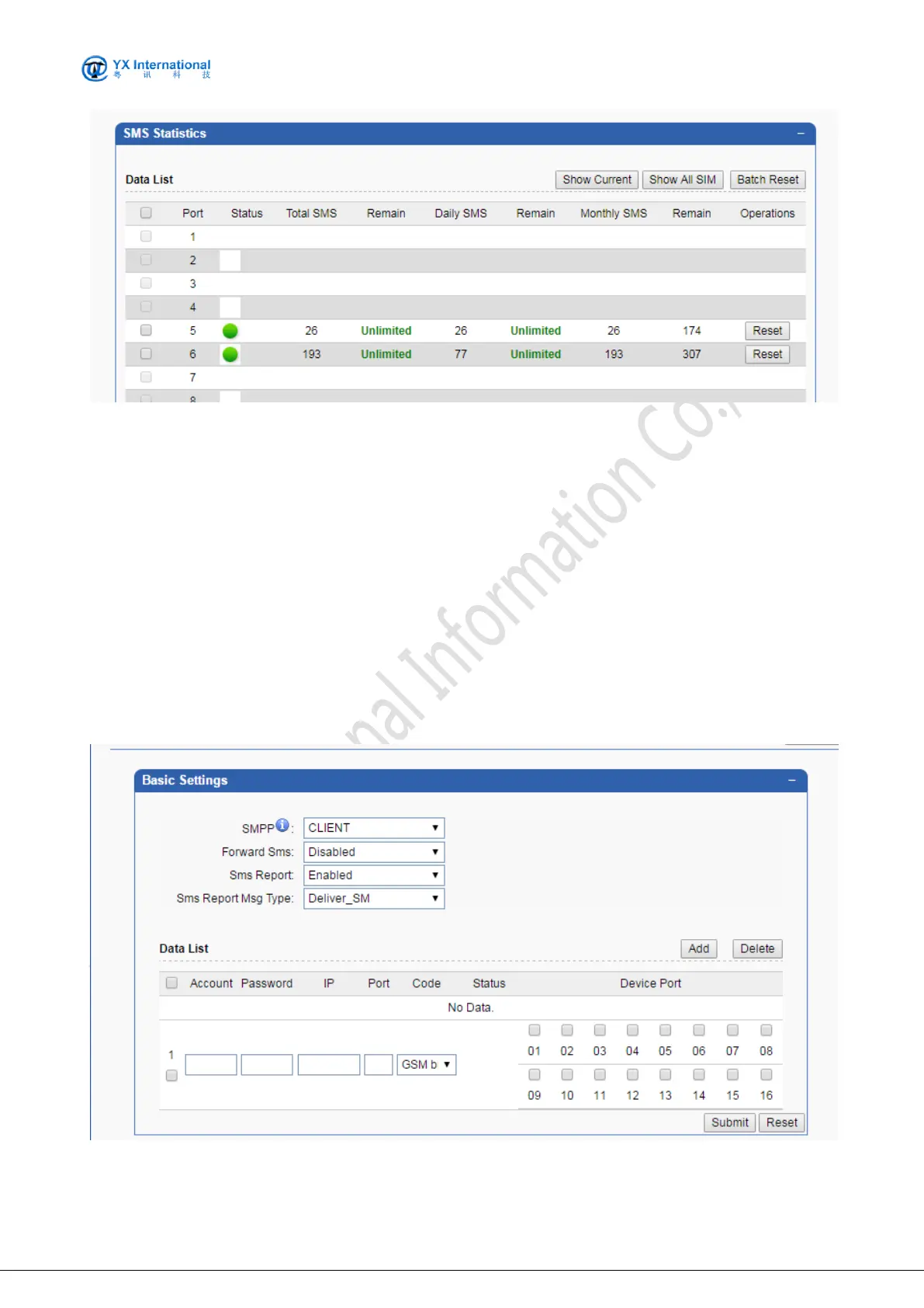 SMS Statistics: Here will be Statistics all ports to send SMS data situation(Reset button to reset
