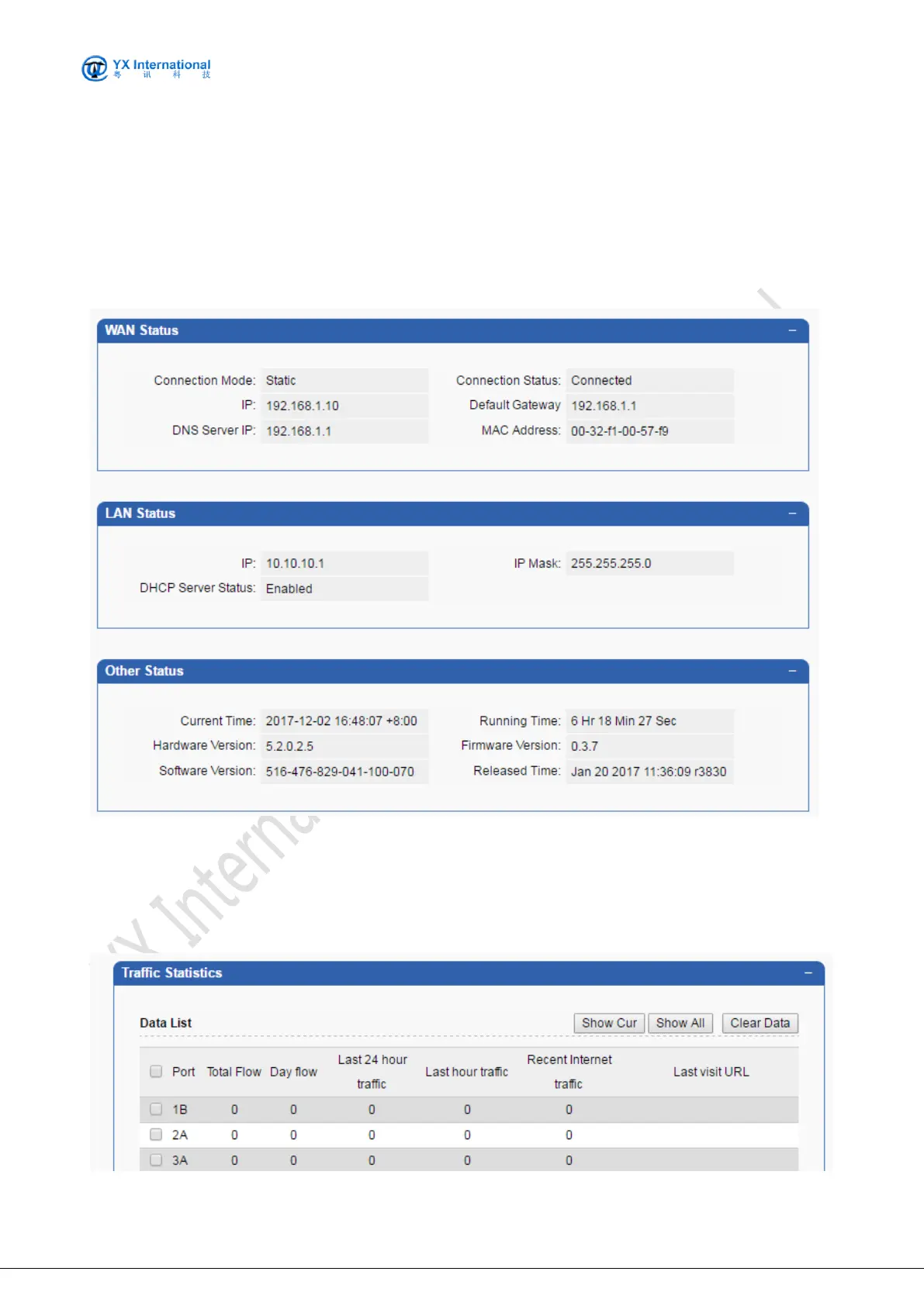 The screenshot below shows the system status. It includes WAN status, LAN(please ignore) and