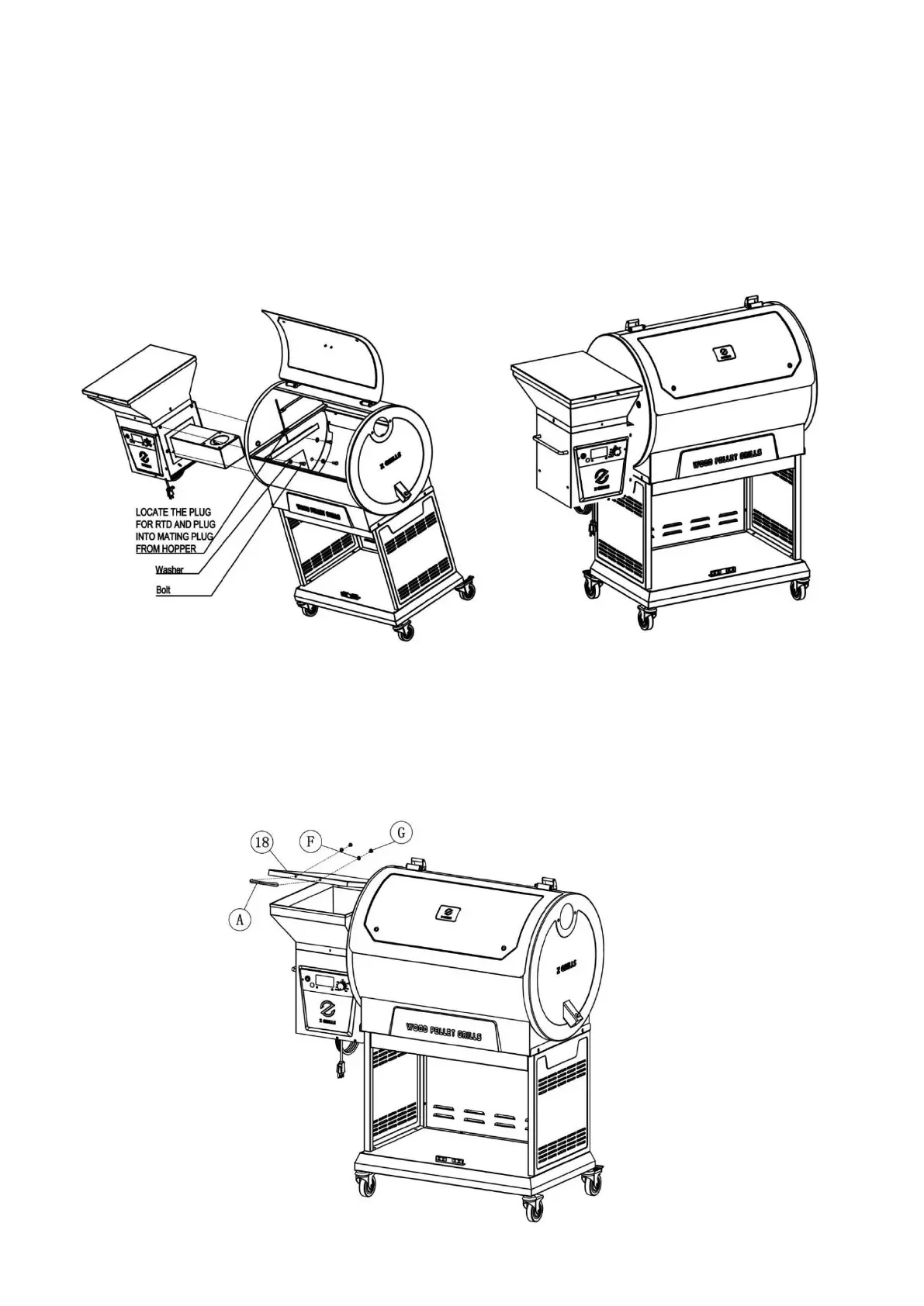 Keep the Hopper Burner Lid (18) open. Insert the Bolt (G) into Gasket (F) and the hole on