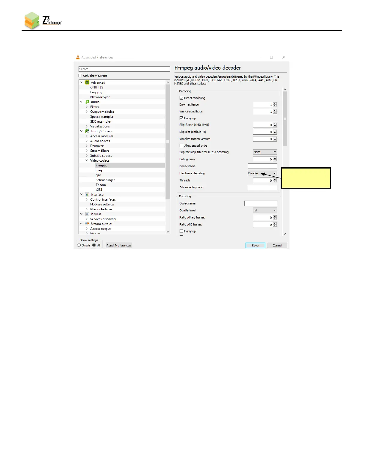 (5) Select Disable in the Hardware decoding dropdown menu.