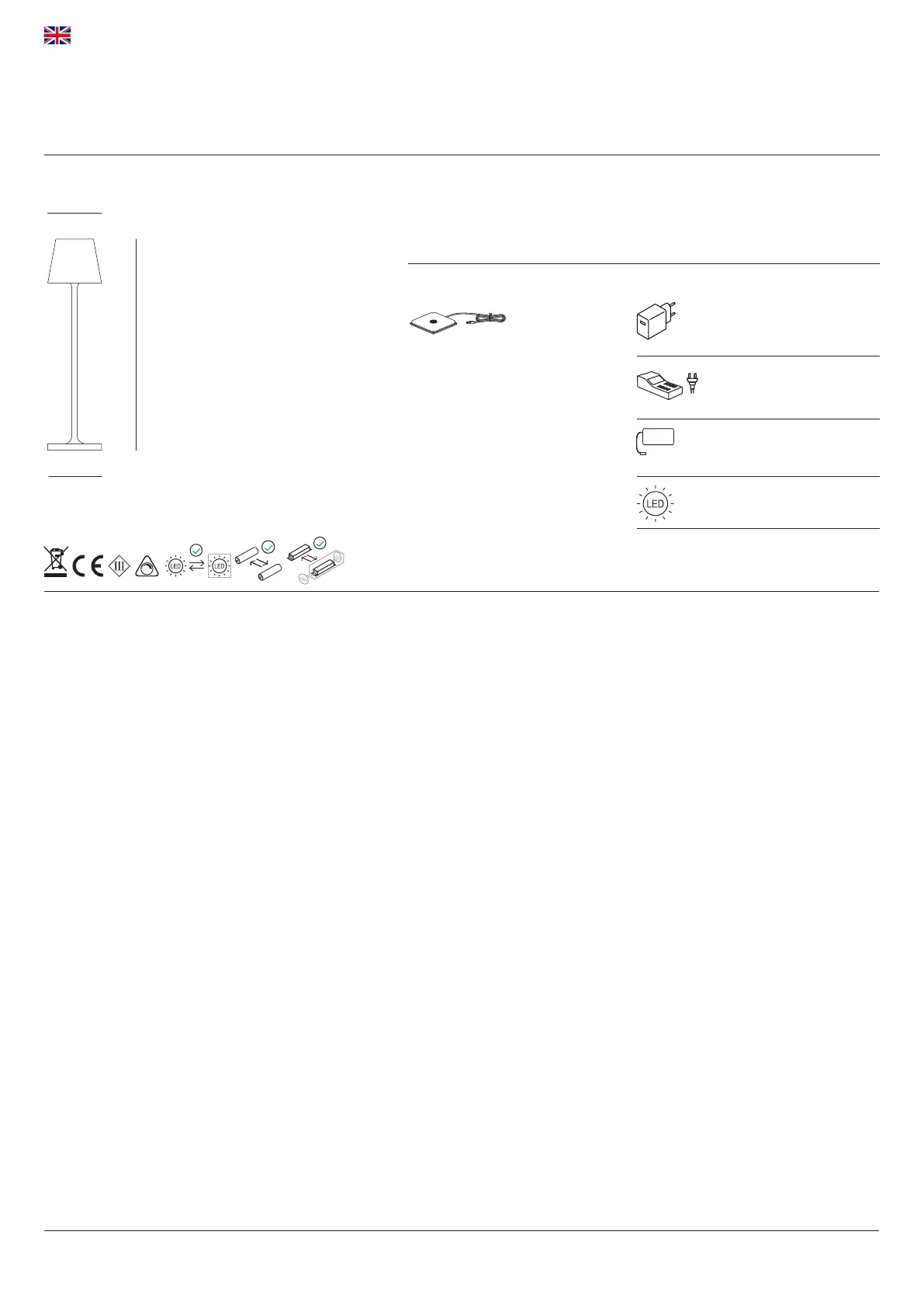 for outdoor use. The light fixture (top) alone and the assembled lamp placed on the recharging base has an IP20 rating, making it unsuitable for