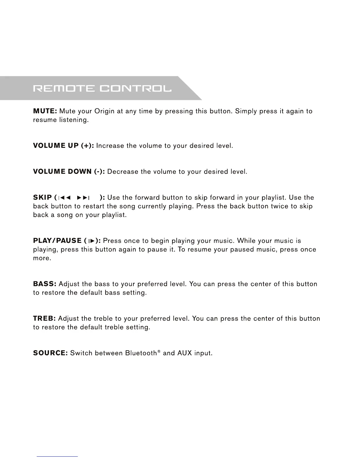 Zagg Origin - ZAGG Origin Remote Control; Remote Control Functions