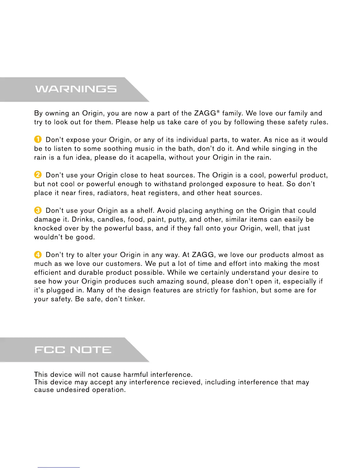 Zagg Origin - ZAGG Origin Warnings and Safety; Product Safety Precautions