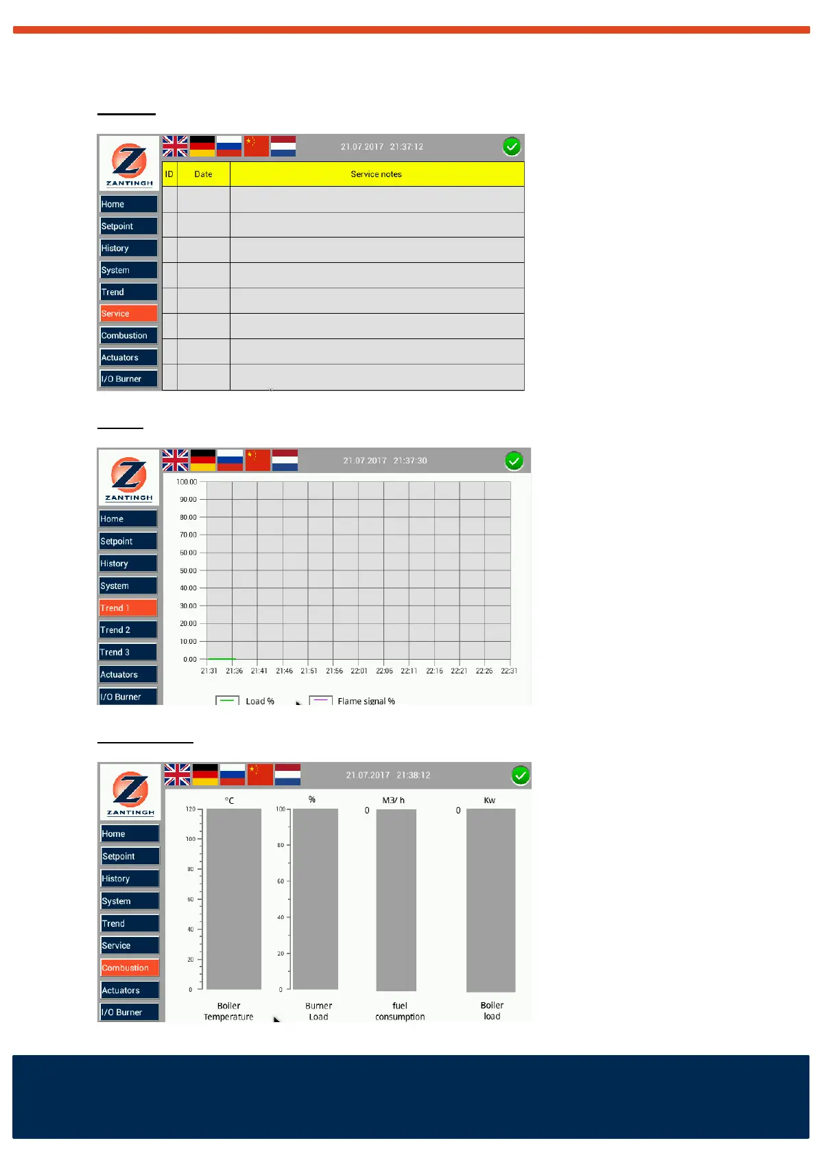 Display of burner load, flame signal and boiler temperature.