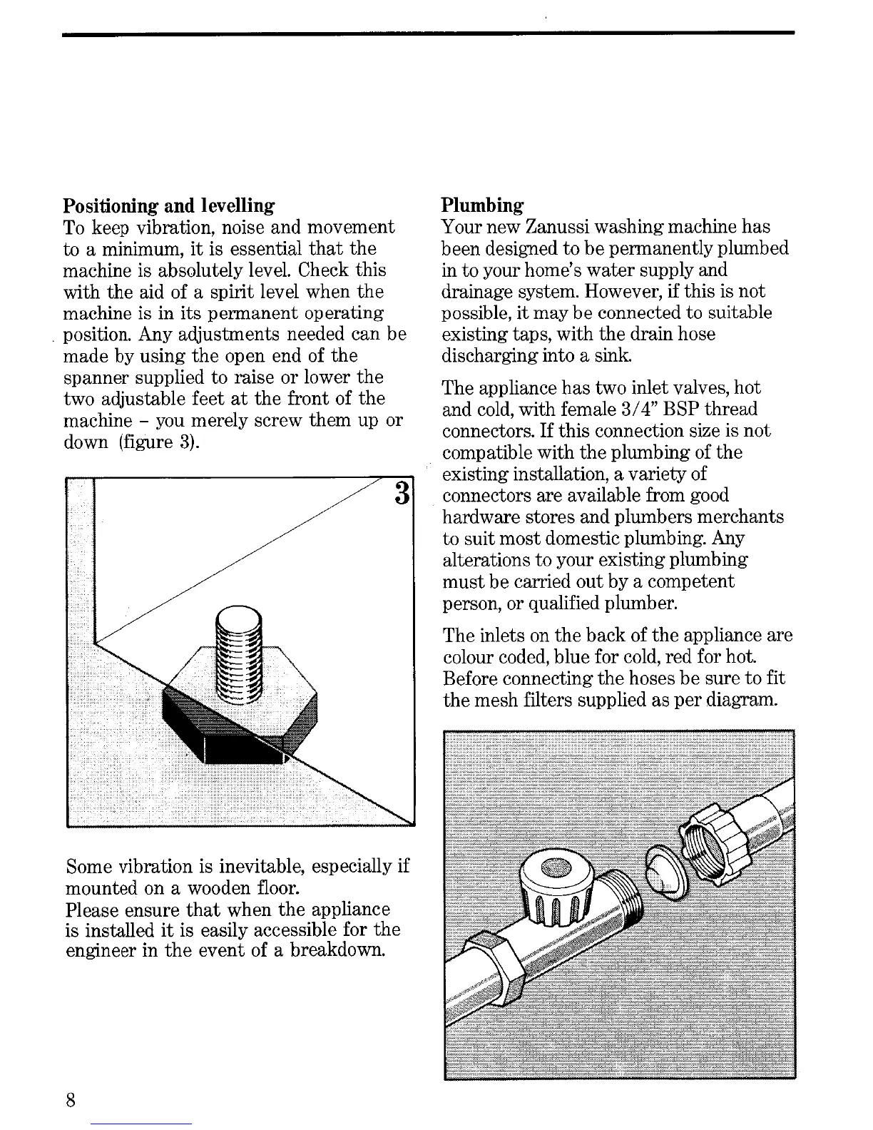 Zanussi FL1012 - Positioning and Levelling; Plumbing