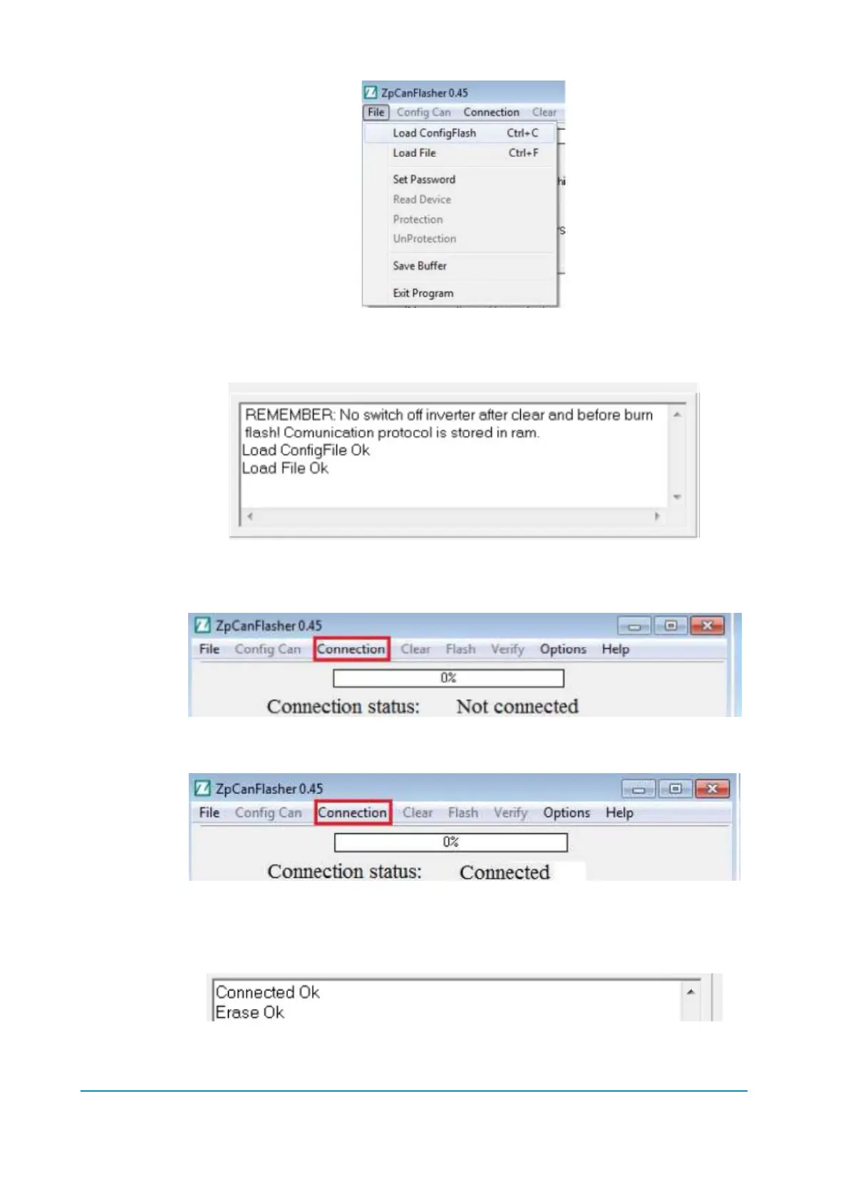 Now the connection must be started, select from the main window ‘Connection’, then