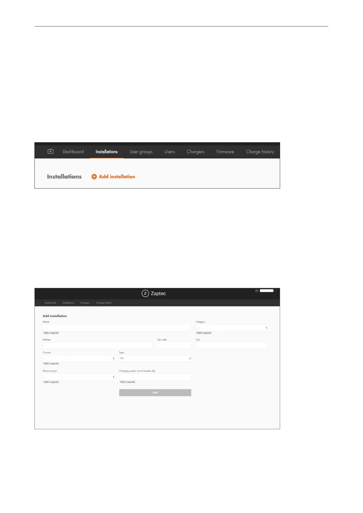 ZaptecPortal-installation går du till Installationer och fyller i formuläret